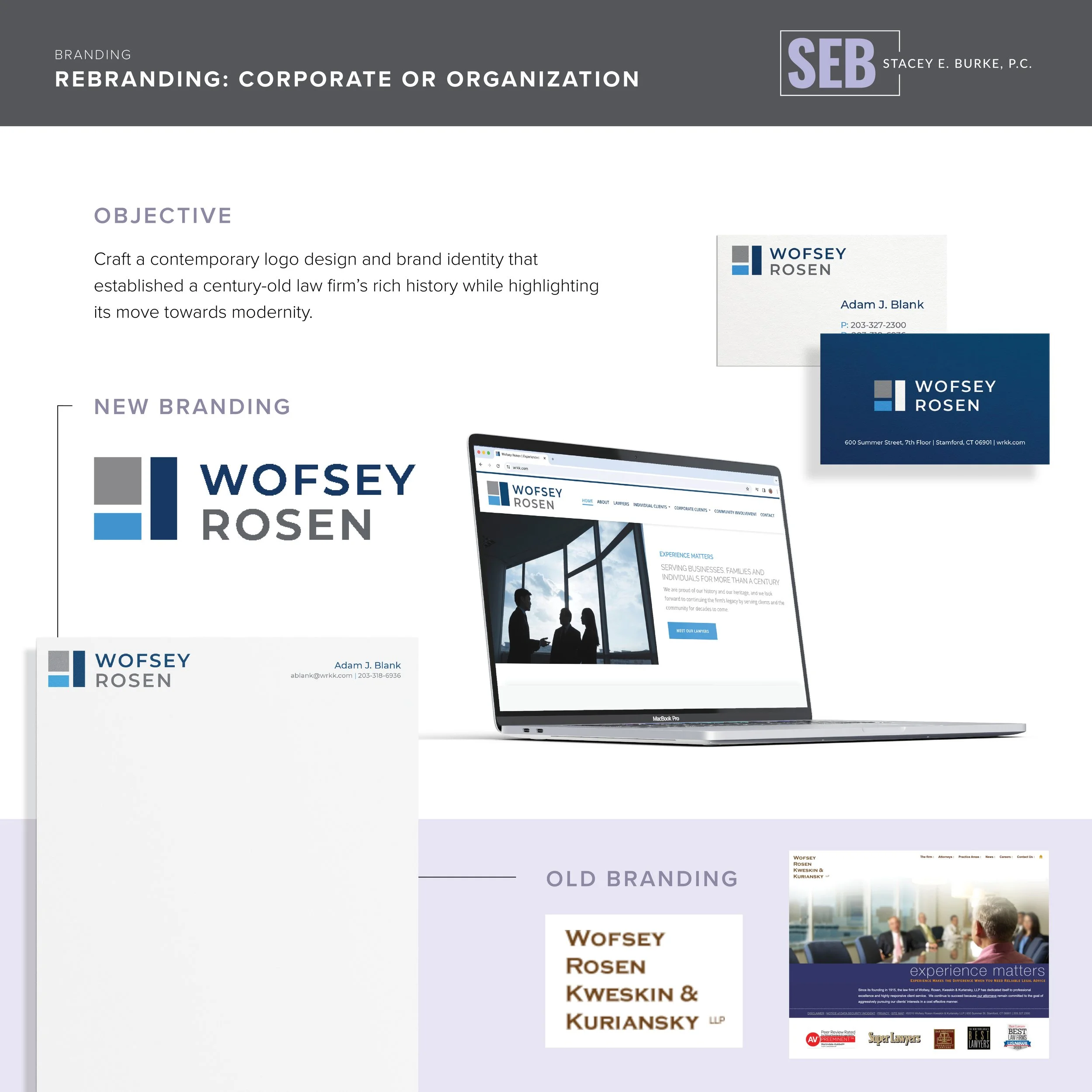 Wofsey, Rosen, Kweskin & Kuriansky, LLP, a law firm established in 1915, sought to modernize its outdated brand to maintain dominance in a competitive market. The firm’s logo was dated, the name was lengthy and difficult to pronounce, and its 15-year-old website failed to reflect the firm’s legacy of excellence and forward-thinking values. The objective was to refresh the firm’s identity to reflect its rich history while positioning it as a contemporary, innovative leader.
