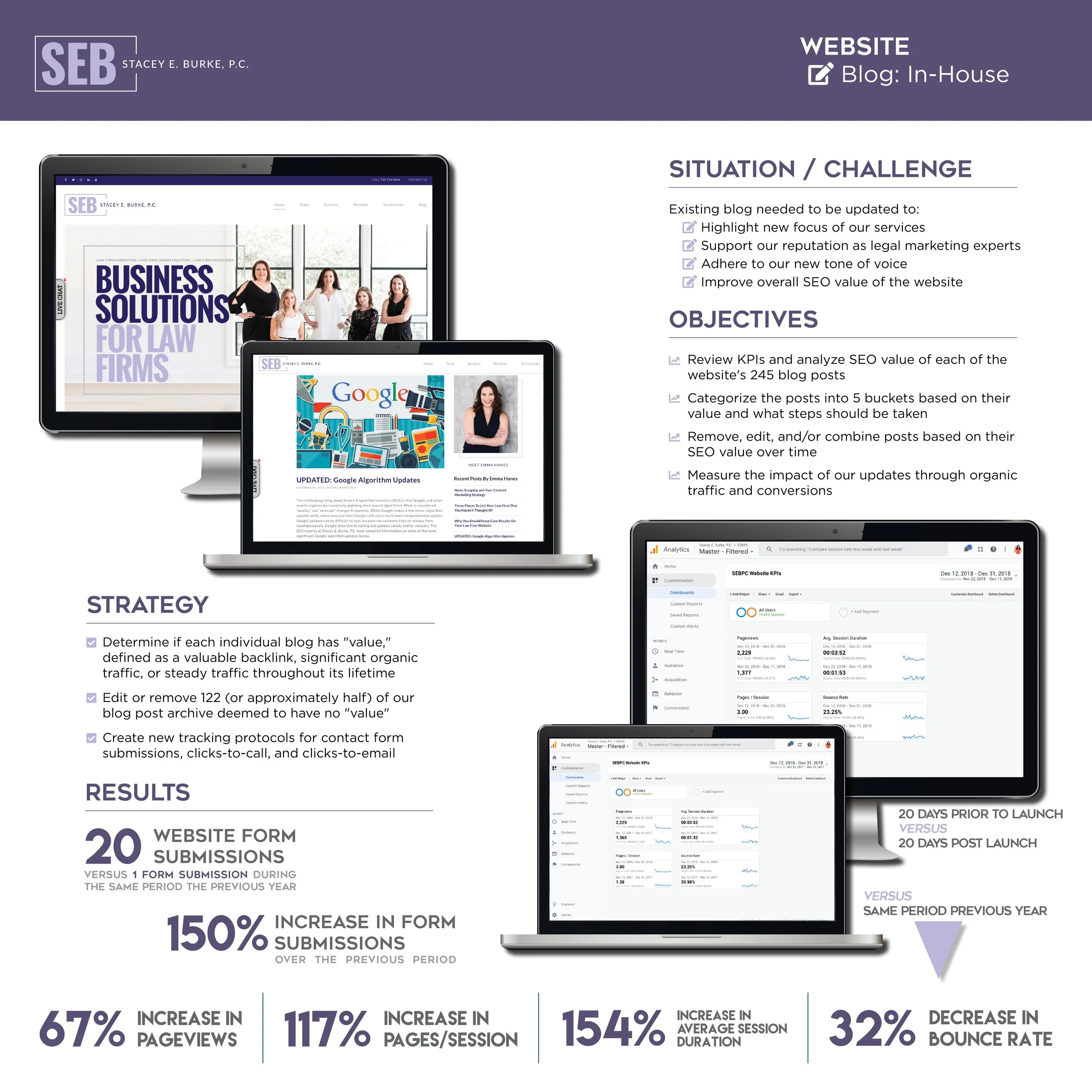 Stacey E. Burke, P.C. (SEBPC) is a marketing agency that focuses on providing digital marketing services for the legal industry. The blog needed to be updated to highlight the true focus of services offered, support our reputation as experts, adhere to our new tone of voice, and improve the overall search engine optimization (SEO) value of the website.