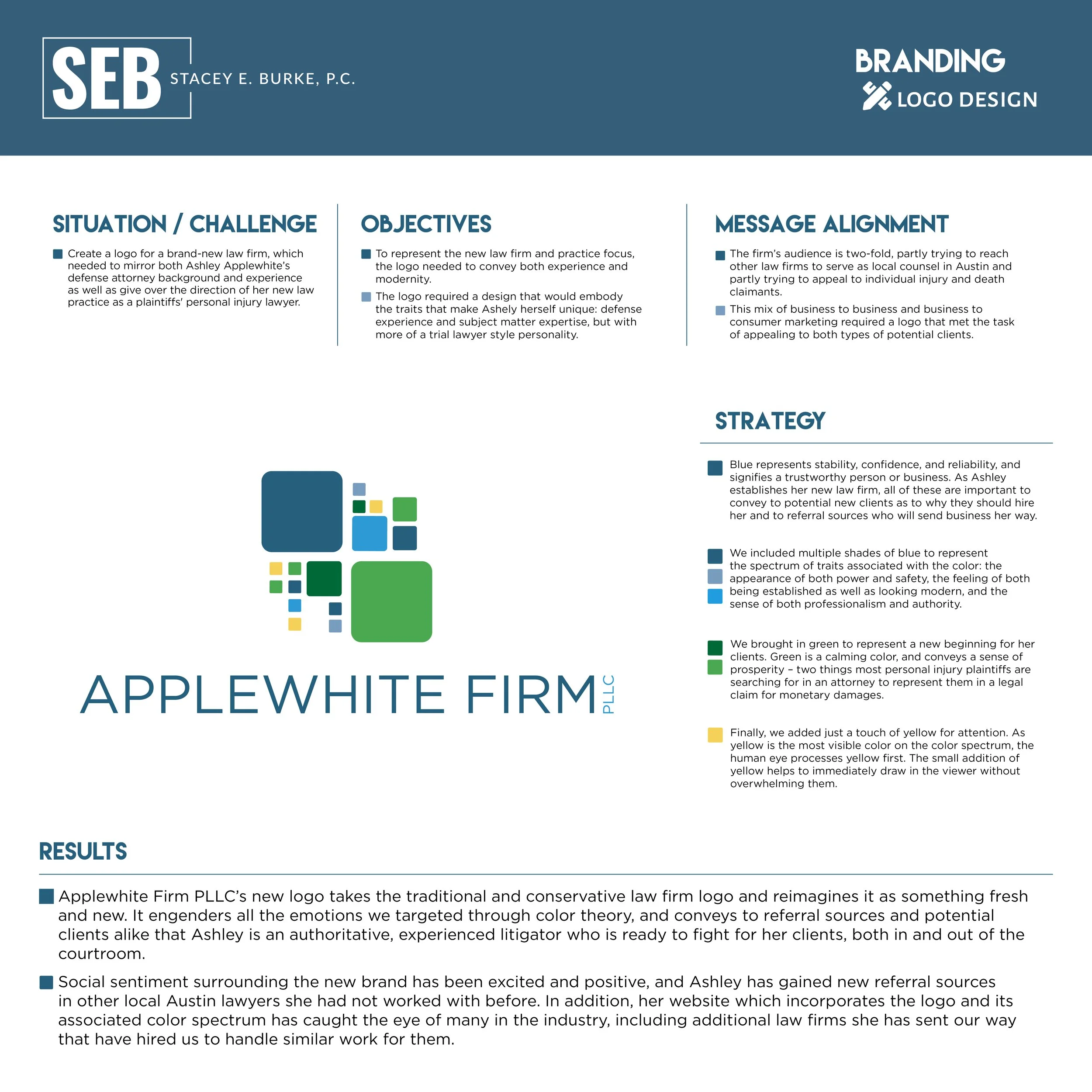 I analyzed color theory in order to develop the logo, utilizing colors that represent characteristics of both the new law firm entity and Ashley herself.